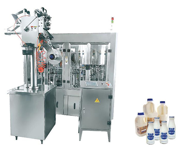 二合一灌装铝箔封口机采用自动定量灌装技术,集灌装、自动制盖(铝 箔)、下盖、封口等功能一体化。特别适用于液体奶生产线的(玻)瓶灌装、封盖、克服牛奶灌装时泡溢现象,是二次牛奶、豆奶、果奶等灌想的自动化设备。